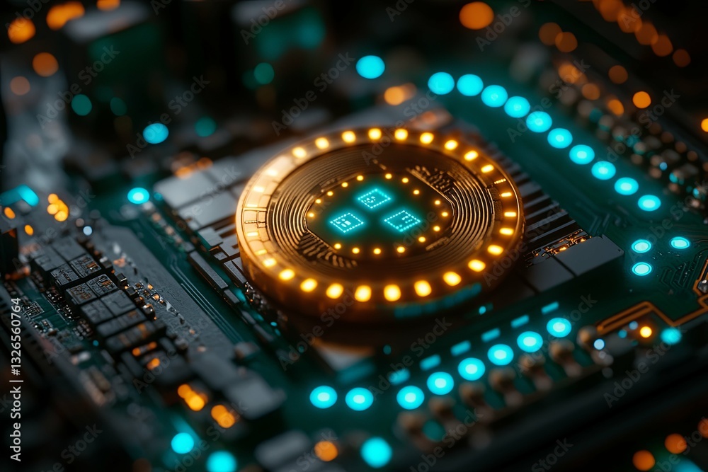 The watermark will not be included on Wall mural.: A glowing coin is placed on a computer circuit board
