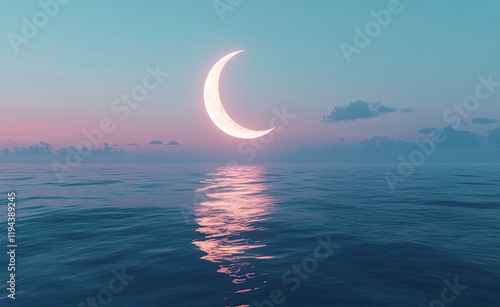 Wall mural a glowing crescent moon circles on the horizon with an ocean in front of it, ethereal and dreamy,