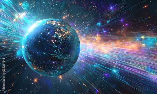 Wall mural a glowing earth with light streaks radiating out in space with stars in the background. - Wall murals Wall mural a glowing earth with light streaks radiating out in space with stars in the background. - Wall murals