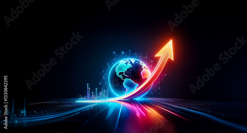Wall mural : A glowing globe with an upward arrow symbolizes global growth and progress in a vibrant neon style a