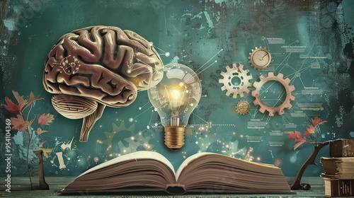 Wall mural a glowing lightbulb above an open book with a human brain and gears in the background, creating an a - Wall murals Wall mural a glowing lightbulb above an open book with a human brain and gears in the background, creating an a - Wall murals