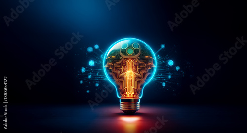 Wall mural a glowing lightbulb with a visible circuit board inside emits a blue light against a dark background