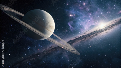 The watermark will not be included on Wall mural.: A glowing planetary disk levitating in an infinite cosmic void, surrounded by subtle star clusters a