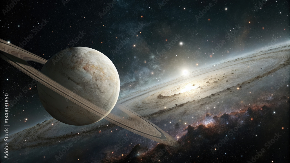 The watermark will not be included on Wall mural.: A glowing planetary disk levitating in an infinite cosmic void, surrounded by subtle star clusters a