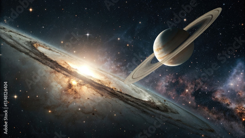 Wall mural a glowing planetary disk levitating in an infinite cosmic void, surrounded by subtle star clusters a