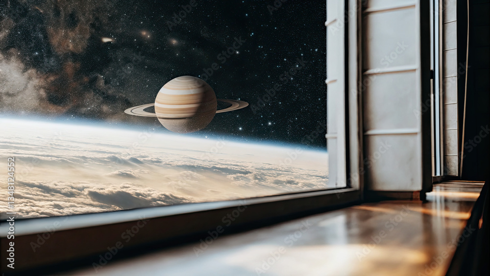 The watermark will not be included on Wall mural.: A glowing planetary disk levitating in an infinite cosmic void, surrounded by subtle star clusters a
