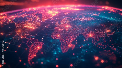 The watermark will not be included on Wall mural.: A glowing red network map of the world with connected dots -