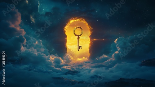 The watermark will not be included on Wall mural.: A glowing sky with a golden key floating near a giant keyhole symbolizing the unveiling of unexplore