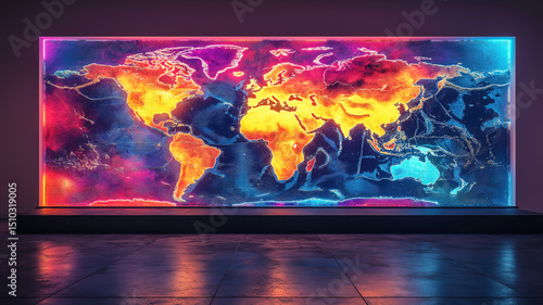 The watermark will not be included on Wall mural.: A glowing world map illuminated with vibrant colors symbolizing global connectivity