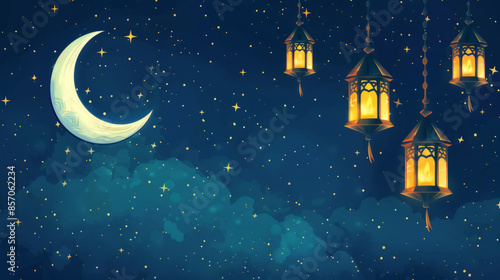 Wall mural : A golden crescent moon with intricate lanterns, floating in a dark background with twinkling stars -