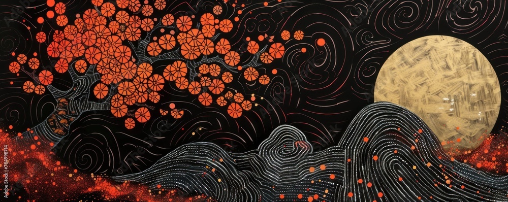 Wall mural a golden full moon rises over a black mountain range. the sky is filled with swirling clouds and a r - Wall murals Wall mural a golden full moon rises over a black mountain range. the sky is filled with swirling clouds and a r - Wall murals