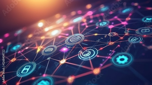 The watermark will not be included on Wall mural.: A graphic of interconnected technology symbols forming a circular pattern on a dark background - stoc