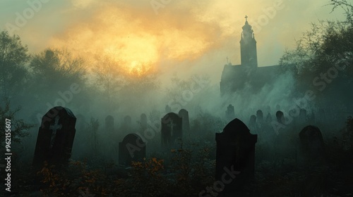 Wall mural a graveyard scene with fog rolling over the tombstones and an eerie, glowing light in the distance - Wall murals Wall mural a graveyard scene with fog rolling over the tombstones and an eerie, glowing light in the distance - Wall murals