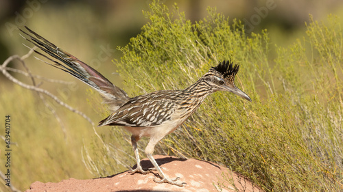 A greater roadrunner stands on top of a sandstone rock with snakeweed behind it while it looks for lWall mural
