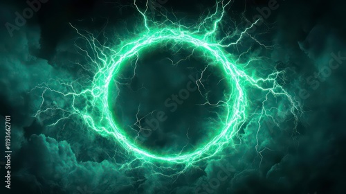 The watermark will not be included on Wall mural.: A green circle with lightning bolts surrounding it on dark background