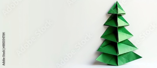 Wall mural a green craft paper christmas tree in origami style on a white background with ample copy space imag