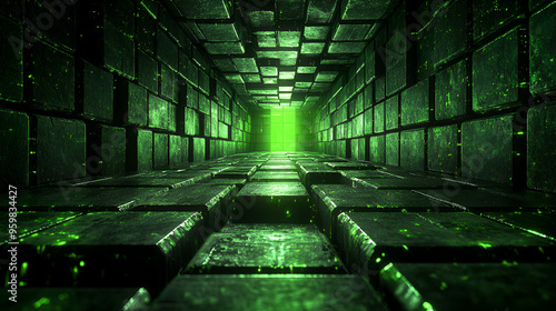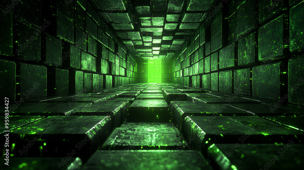 Wall mural a green-lit tunnel made of textured bricks leads to a glowing exit, creating a sense of depth and my - Wall murals Wall mural a green-lit tunnel made of textured bricks leads to a glowing exit, creating a sense of depth and my - Wall murals