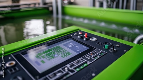 The watermark will not be included on Wall mural.: A green machine with a screen that has a number of buttons on it
