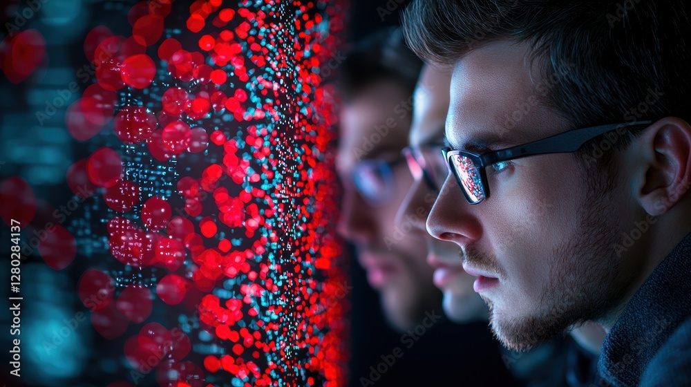 The watermark will not be included on Wall mural.: A group of concerned business professionals gathered around a computer screen displaying data breach
