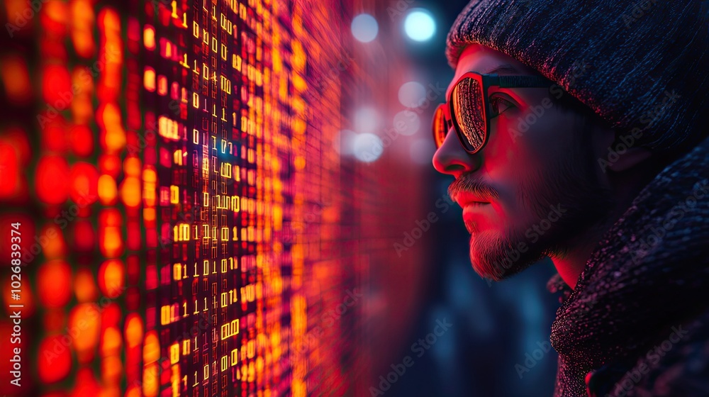 The watermark will not be included on Wall mural.: A hacker coding a virus or ransomware, depicted with abstract binary code, representing cyberattacks