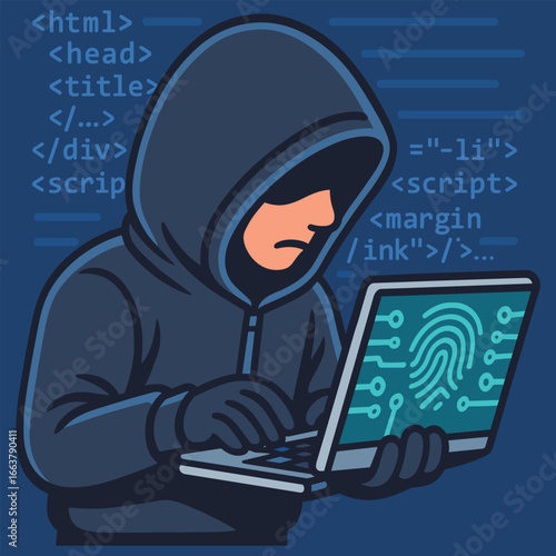 Wall mural a hacker in hoodie typing on laptop with digital fingerprint and coding background vector cartoon