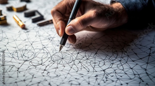 A hand drawing geometric patterns on a large sheet of paper, emphasizing precisionWall mural