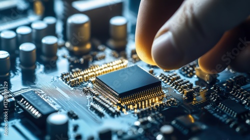 Wall mural a hand inserting a quantum processor chip into a quantum computer motherboard, visible gold connecto - Wall murals Wall mural a hand inserting a quantum processor chip into a quantum computer motherboard, visible gold connecto - Wall murals