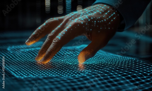 The watermark will not be included on Wall mural.: A hand interacts with a digital grid, illustrating technology and data visualization -