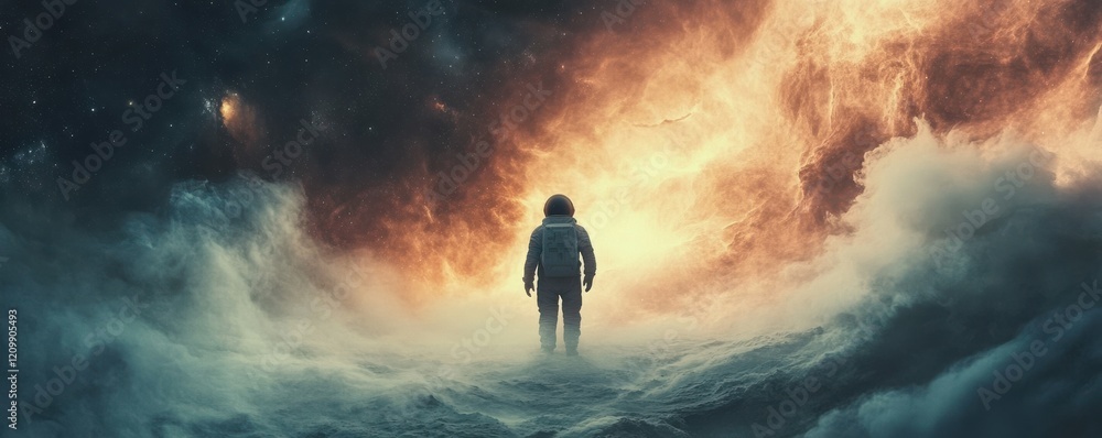 The watermark will not be included on Wall mural.: A haunting image of a lone astronaut floating in the vast emptiness of space, dwarfed by the swirlin