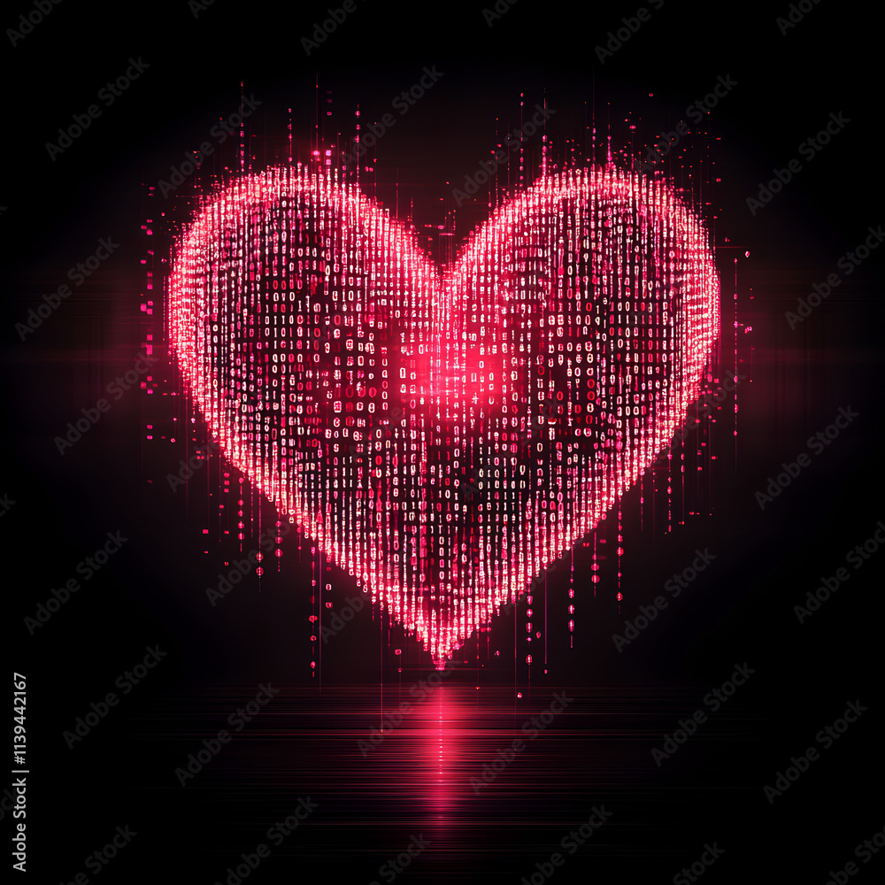The watermark will not be included on Wall mural.: A heart made of binary code - the heart is red and has a black background - the heart is surrounded by