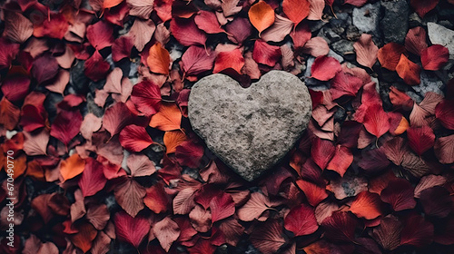 The watermark will not be included on Wall mural.: A heart-shaped stone autumn fall leaves background