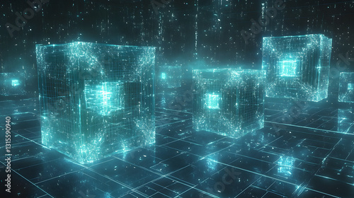 The watermark will not be included on Wall mural.: A high-resolution digital artwork depicting a futuristic blockchain concept with glowing blue cubes