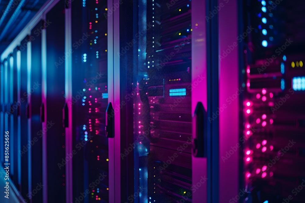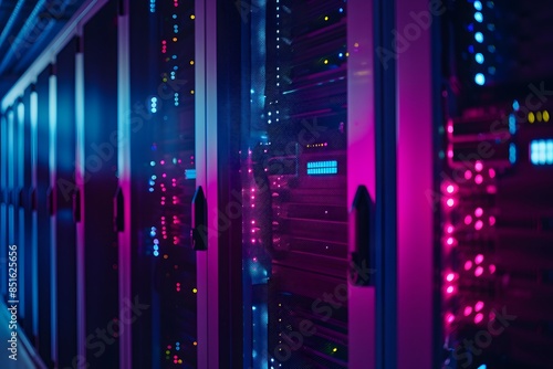 The watermark will not be included on Wall mural.: A high-tech data center with rows of glowing blue and purple server cabinets, illuminated by soft pi