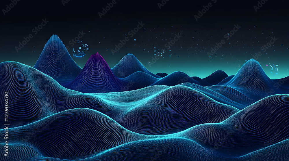 The watermark will not be included on Wall mural.: A high-tech digital landscape with layered waveforms in deep blue and neon teal, accented by glitch