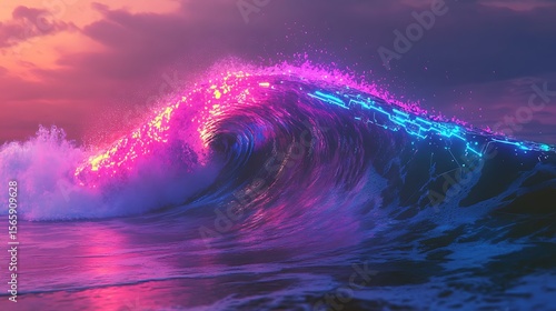 Wall mural a high-tech neon wave breaking on the shore with glowing colors in a digital setting