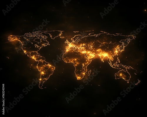 Wall mural : A hightech 3d design of a digital world map scheme with illuminated points and lines, symbolizing gl