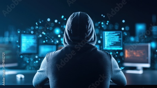 Wall mural a hooded figure in a dark room illuminated by the glow of multiple computer screens, working on cybe