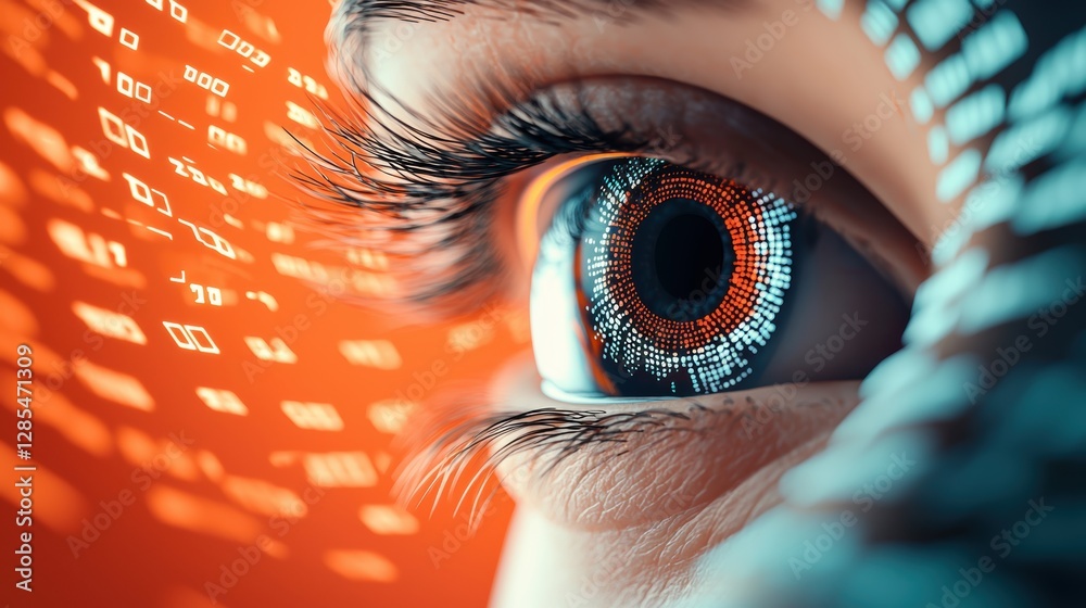 The watermark will not be included on Wall mural.: A human eye superimposed on a background of flowing binary code, representing the concept of data an