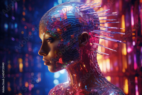 Wall mural a humanoid creature in a digital world with binary codes and holographic elements. it represents lif