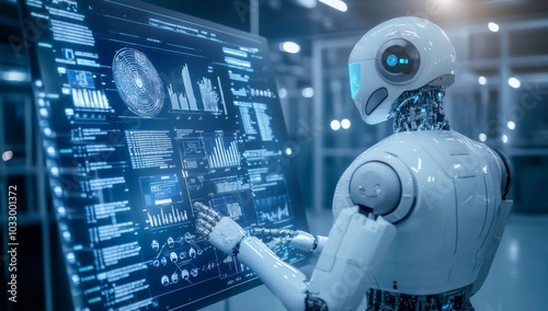 Wall mural : A humanoid robot with glowing blue eyes interacts with a large digital screen displaying data and gr