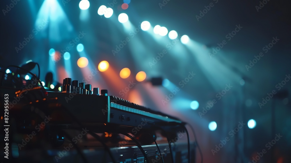 The watermark will not be included on Wall mural.: A keyboard on a stage with lights in the background -