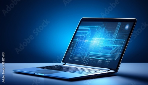 Wall mural : A laptop computer is displayed on a table with a blue background
