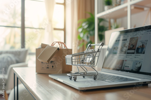 Wall mural a laptop computer is open to a website with a shopping cart with shopping bag - Wall murals Wall mural a laptop computer is open to a website with a shopping cart with shopping bag - Wall murals