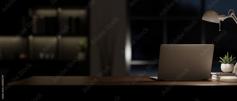 Wall mural a laptop computer on a table in a modern dark room at night with a dim light from a table lamp.