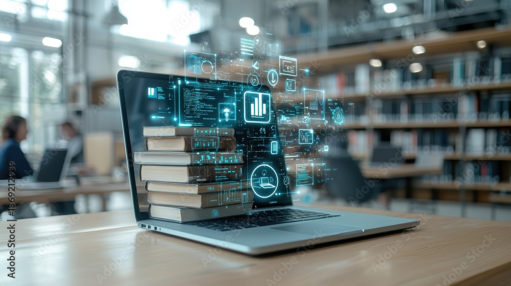 Wall mural a laptop computer situated on a desk in a modern library environment showcasing a digital interface  - Wall murals Wall mural a laptop computer situated on a desk in a modern library environment showcasing a digital interface - Wall murals