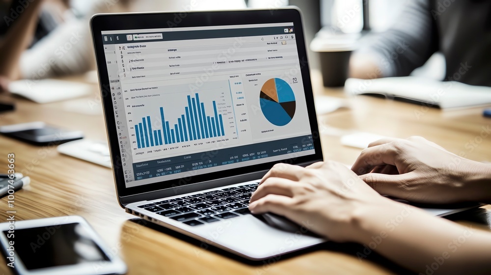 Wall mural a laptop is open to a screen displaying a pie chart - Wall murals Wall mural a laptop is open to a screen displaying a pie chart - Wall murals
