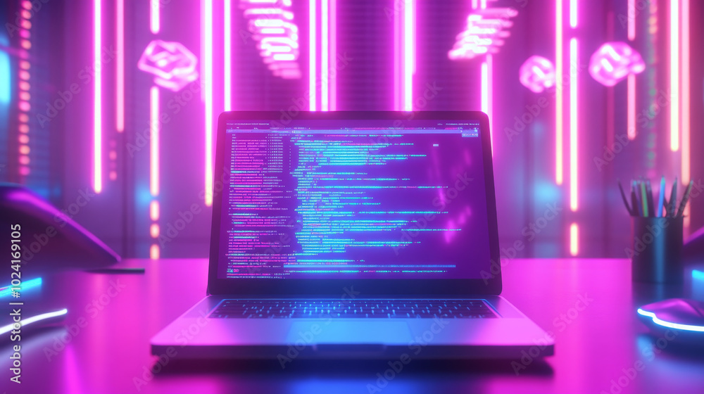 A laptop with its screen open sits on a desk - the screen shows lines of computer code - the background Wall mural