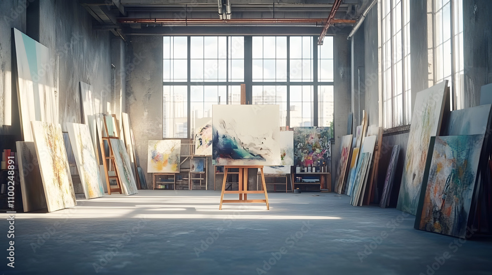 The watermark will not be included on Wall mural.: A large, empty art studio with an easel displaying an abstract painting and multiple paintings leani