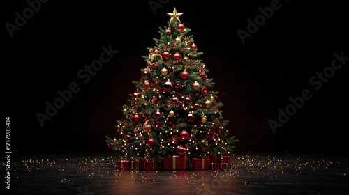 Wall mural a large christmas tree with many ornaments and a star on top. the tree is lit up and surrounded by a - Wall murals Wall mural a large christmas tree with many ornaments and a star on top. the tree is lit up and surrounded by a - Wall murals