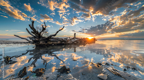The watermark will not be included on Wall mural.: A large log is floating in the water, with the sun setting in the background